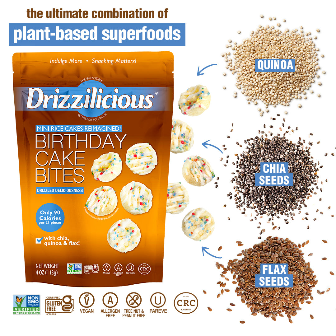 Our Drizzilicious Birthday Cake bites are mini rice cakes reimagined!